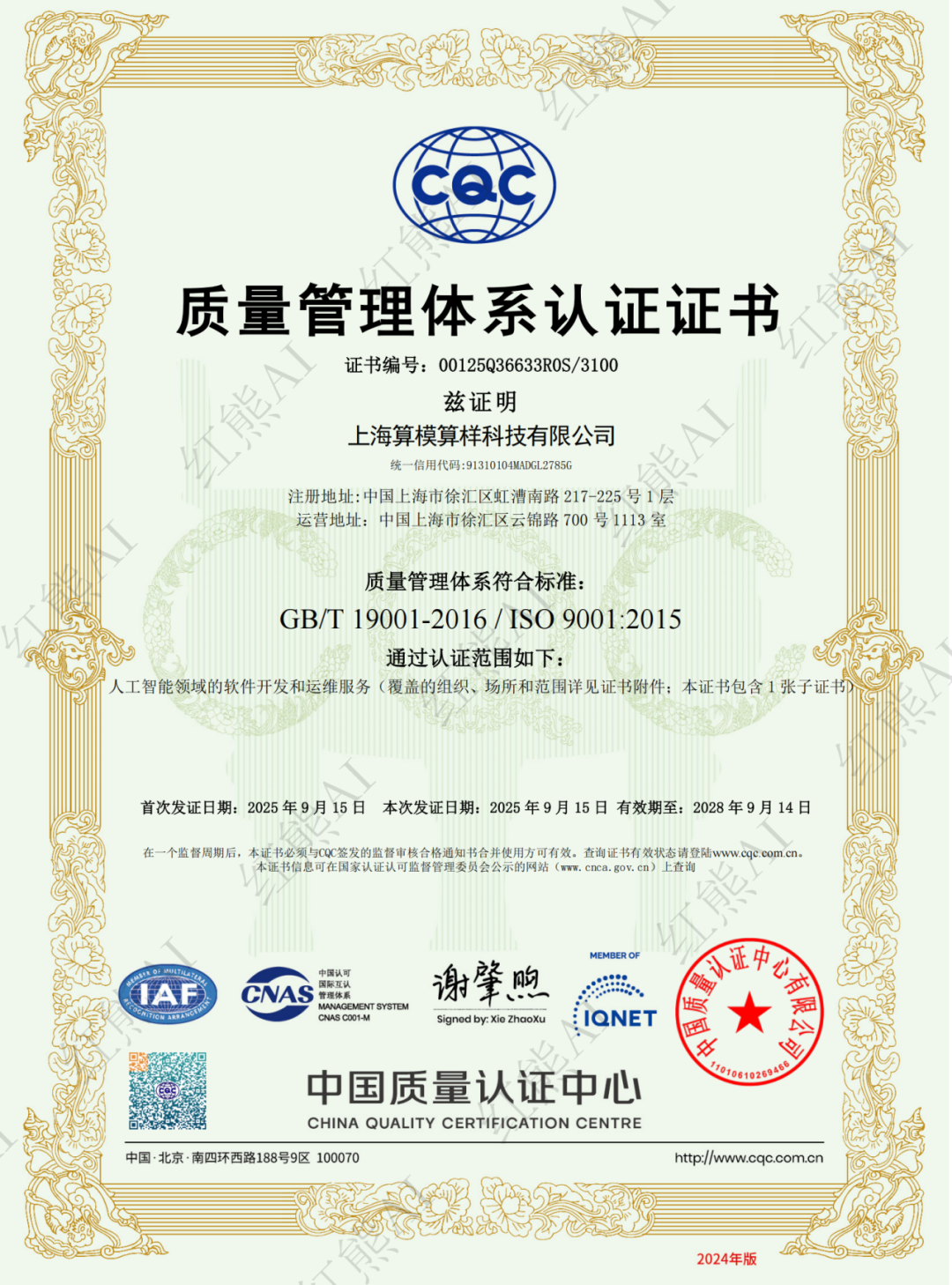 近日,红熊AI(上海算模算样科技有限公司)正式通过中国质量认证中心的审核与评估,荣获ISO9001质量管理体系认证证书。